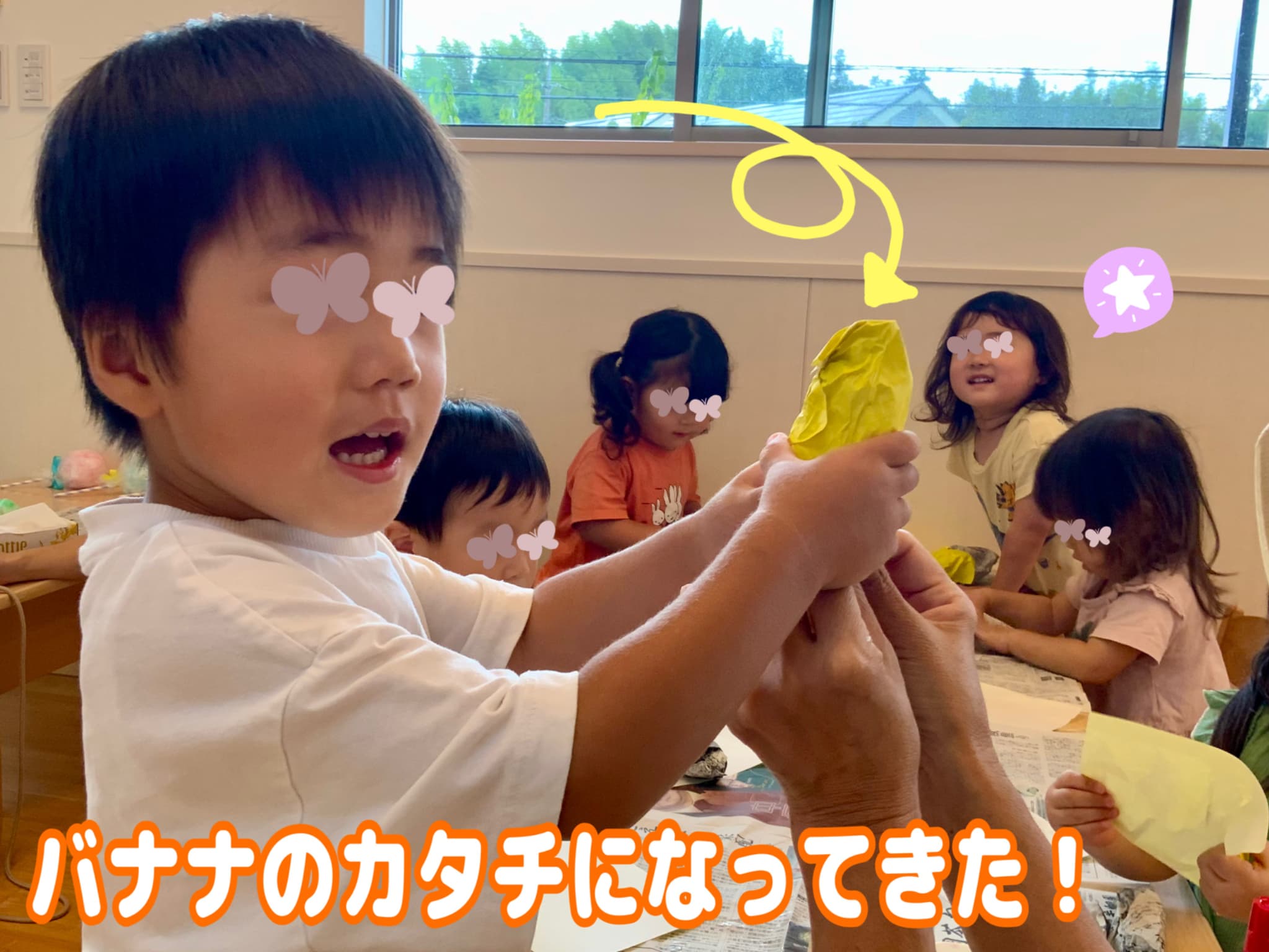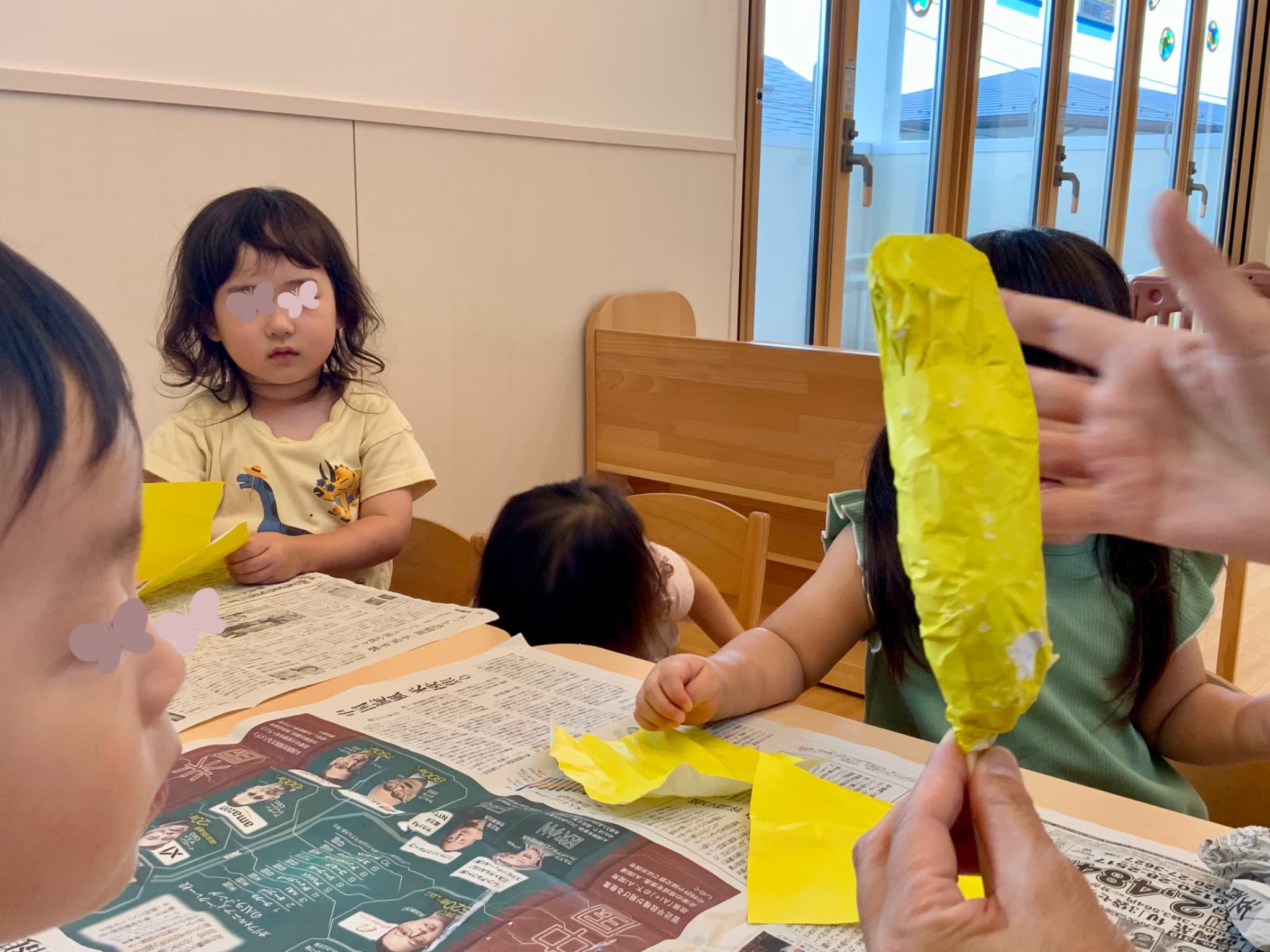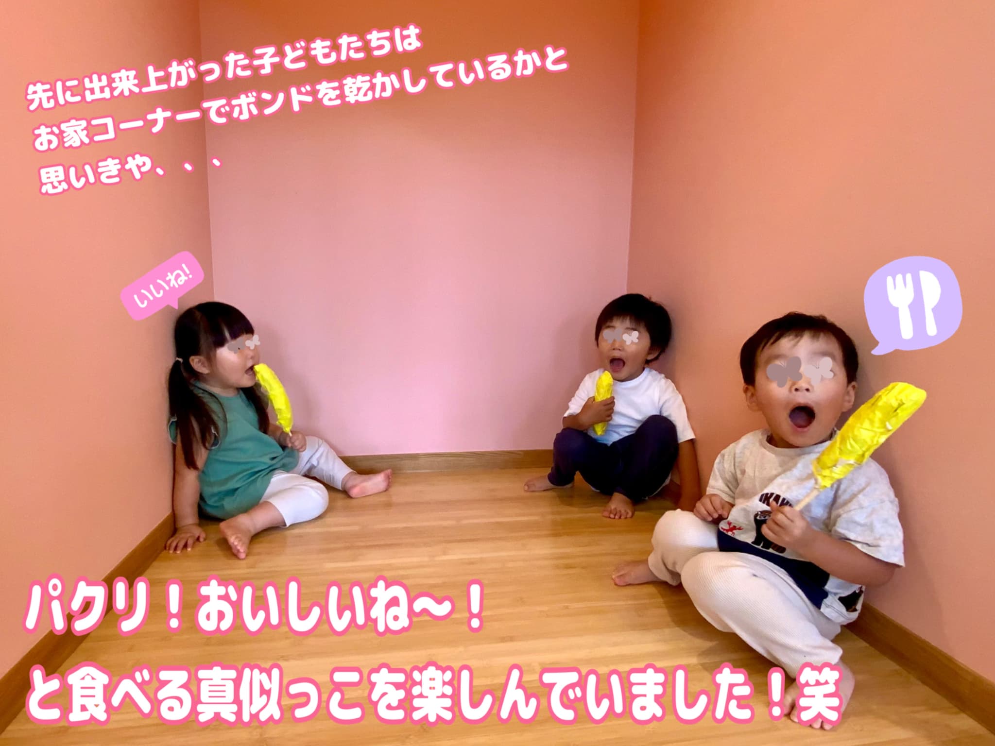 完成した子どもから出来上がったバナナのボンドが乾くのを遊戯室のお家コーナーで座って待っているんだな〜と思ったら『おいしいね〜!』とたべる真似っこをしながらバナナパーティーの真っ最中でした😂