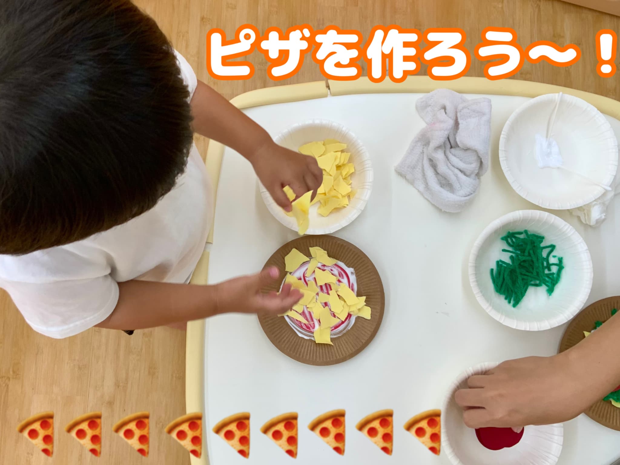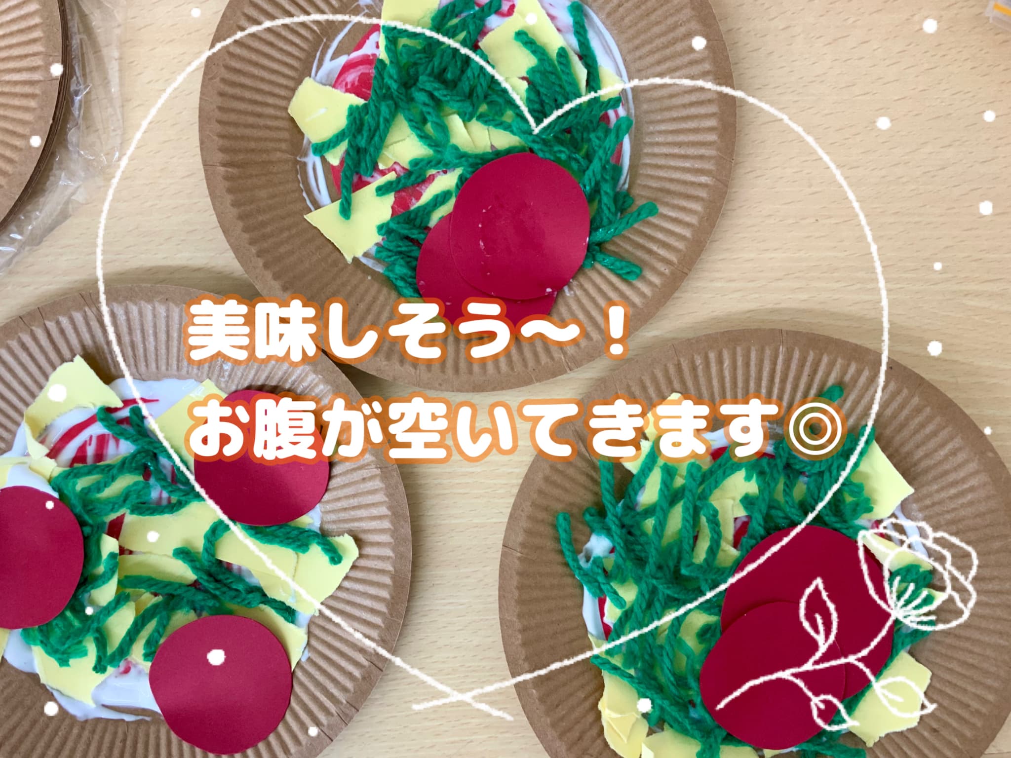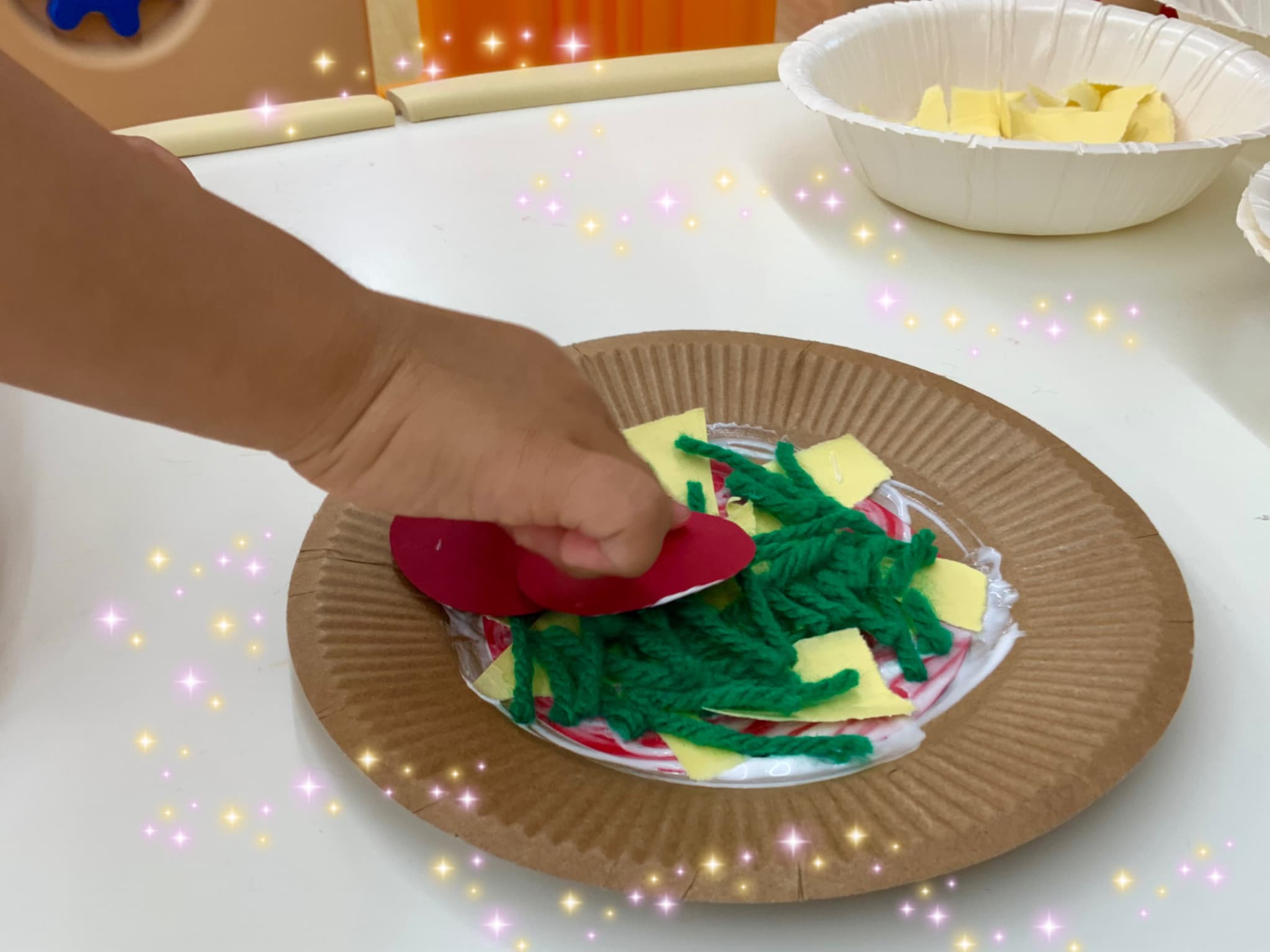 1歳児クラスのピザ作りでは、紙や毛糸を使って具材を表現しながら製作しました!