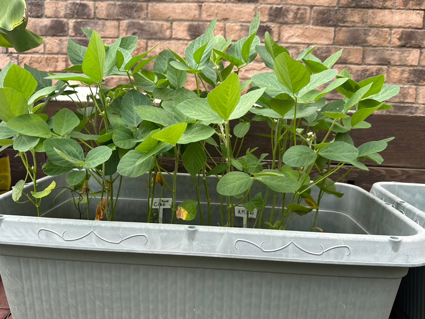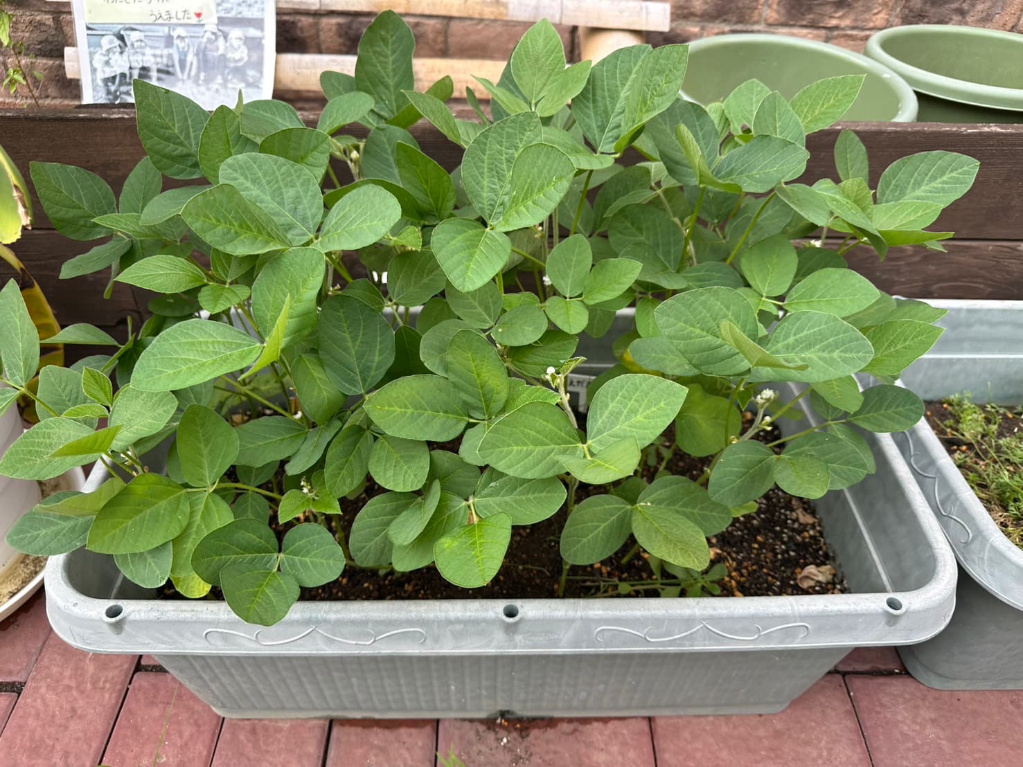 枝豆は葉っぱが大きくなり、プランターいっぱいに広がるほどに元気に成長中!