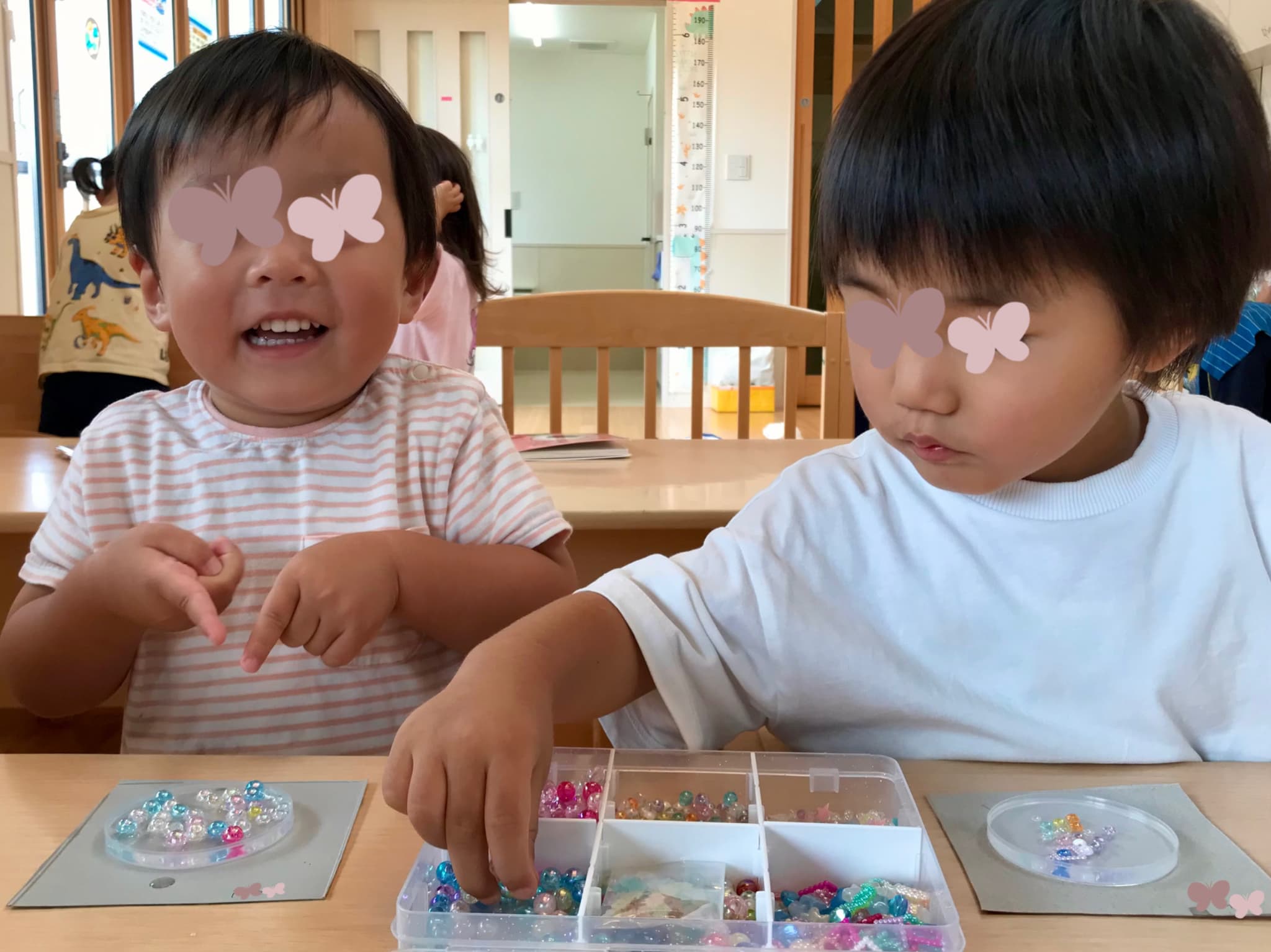 2歳児クラスでは、きらきらのビーズと洗濯のりを使って吊るし飾りを製作!
