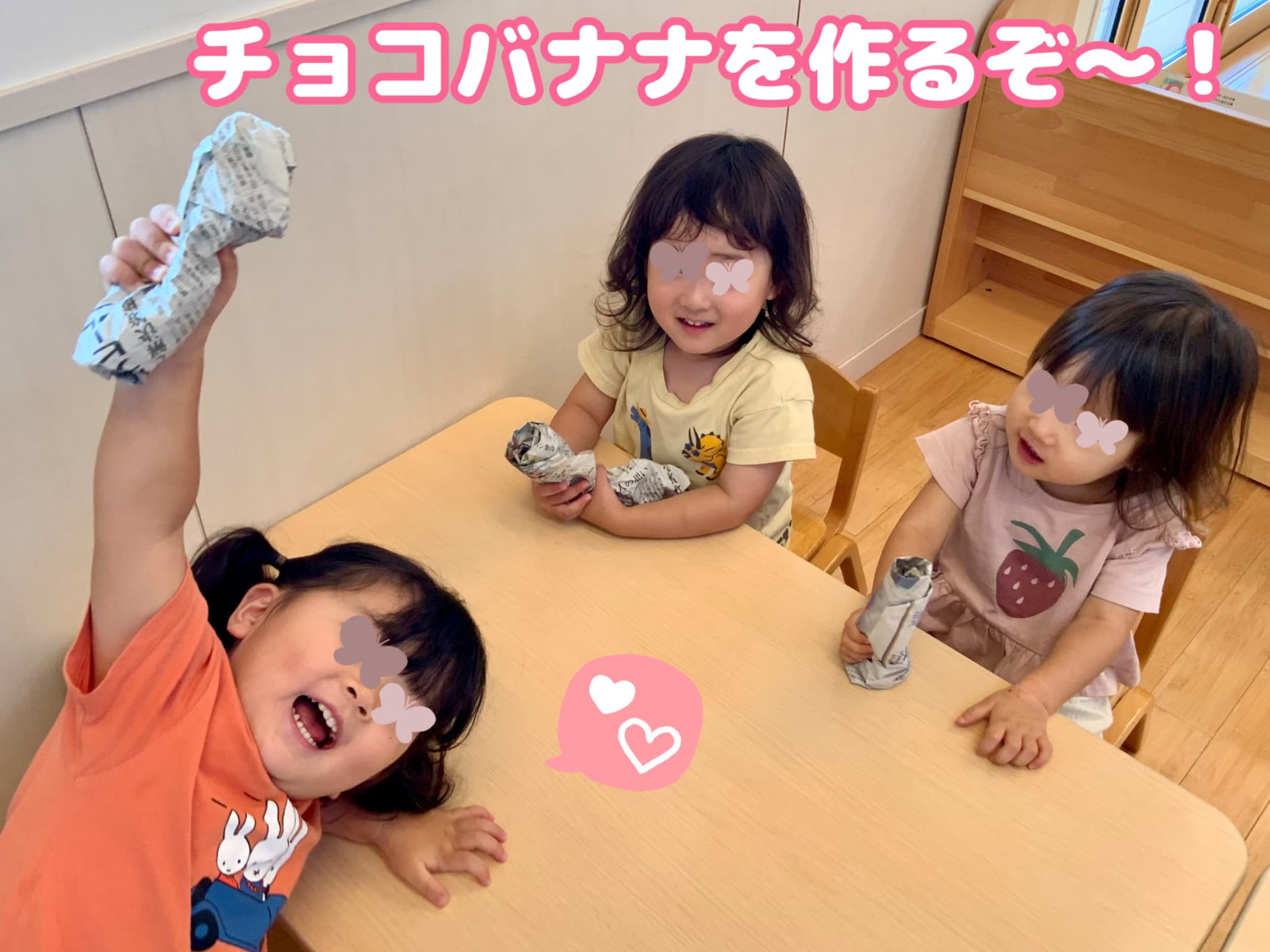 実はこのチョコバナナの製作は、子どもたちの中で地域のお祭りで食べたチョコバナナを「作りたい!」と言ったことがきっかけで始まりました♪