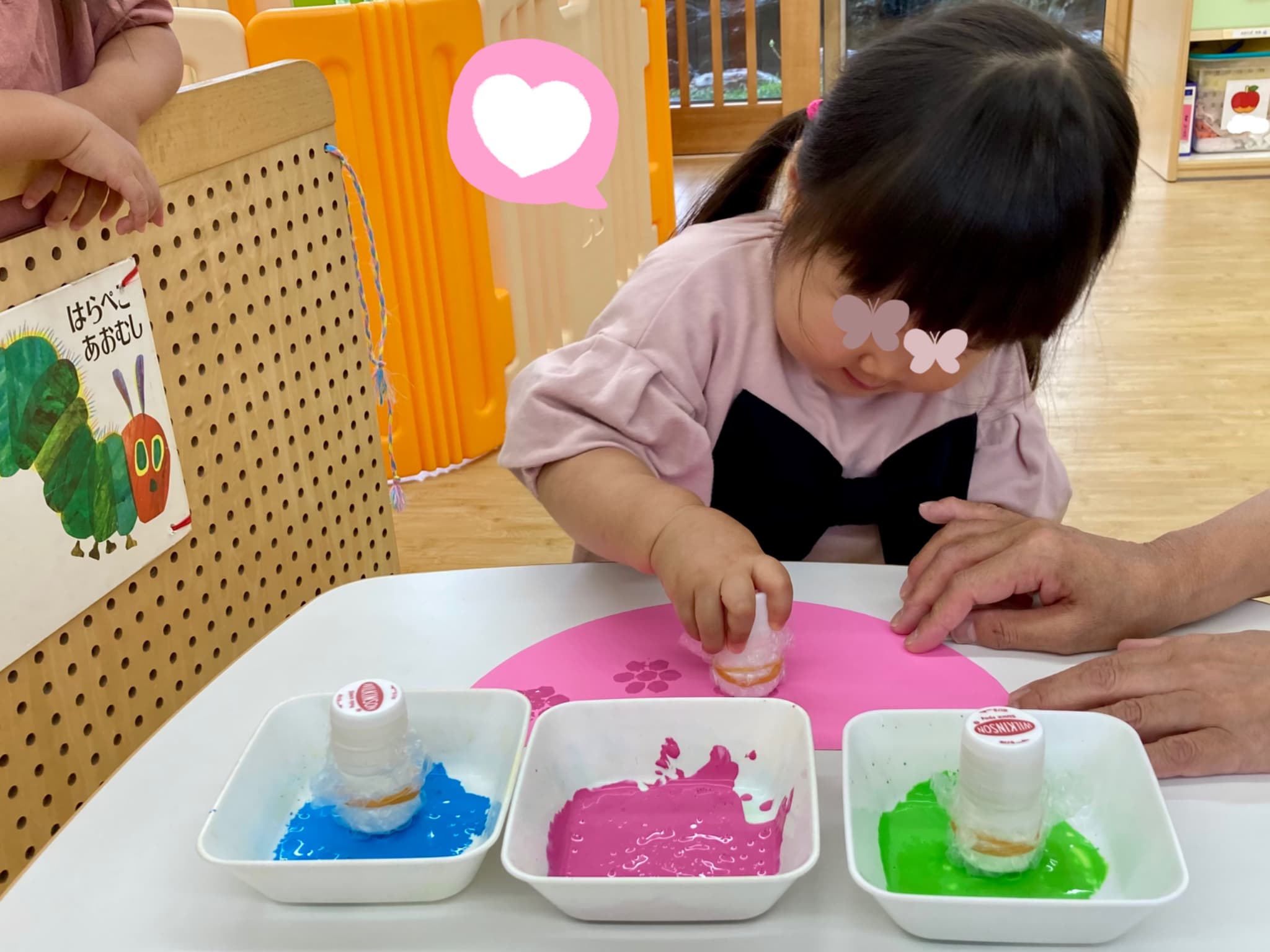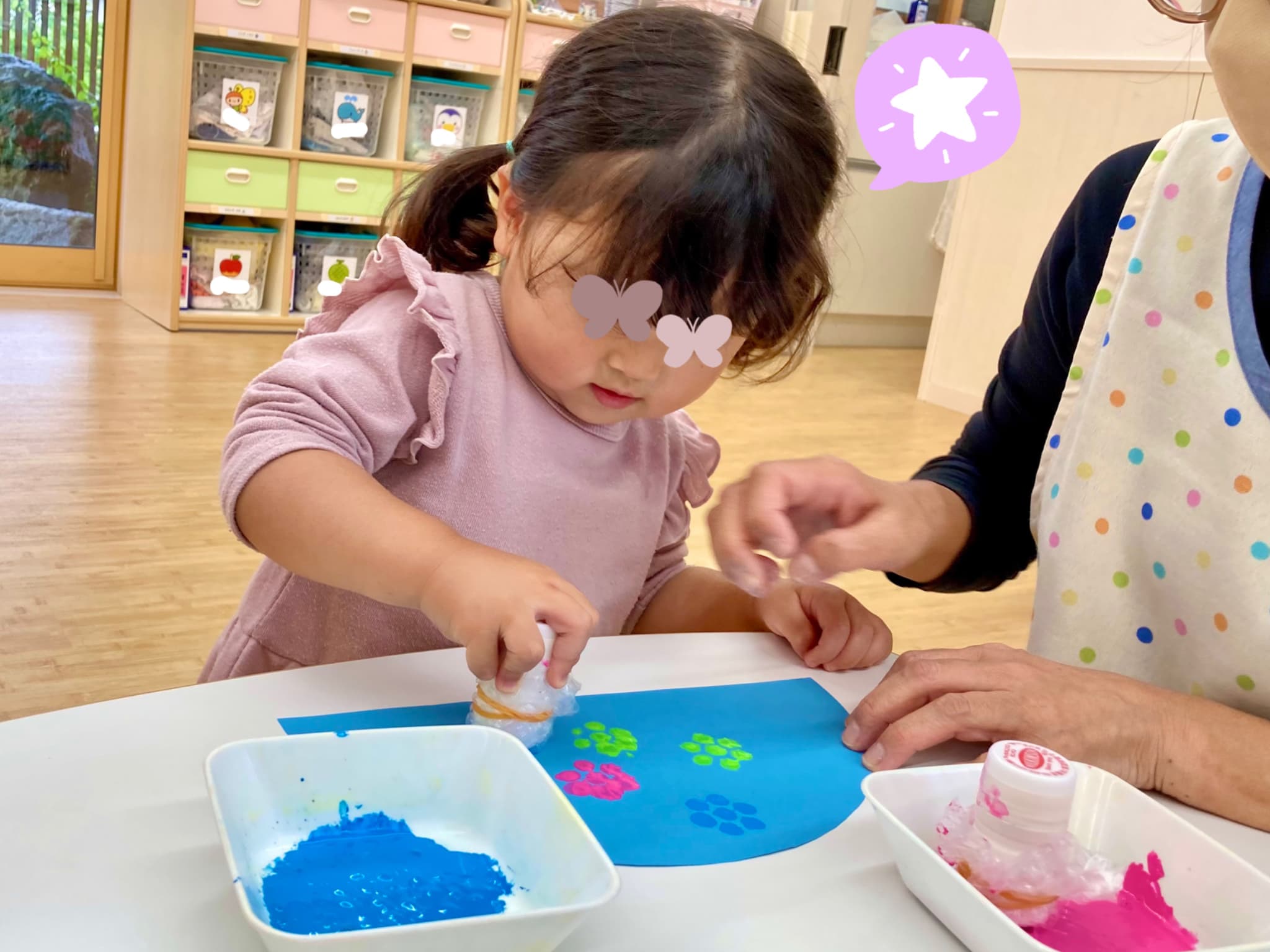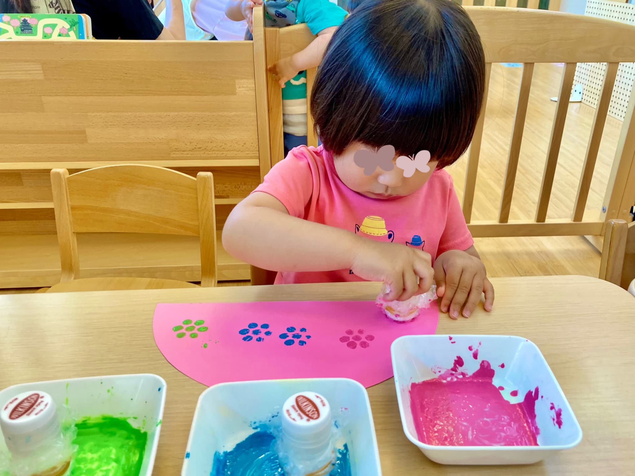 濃いめの絵の具を使って、スポンジスタンプでポンポンと色をのせていきます。使った色は、緑・ピンク・青の3色🌿💗💙