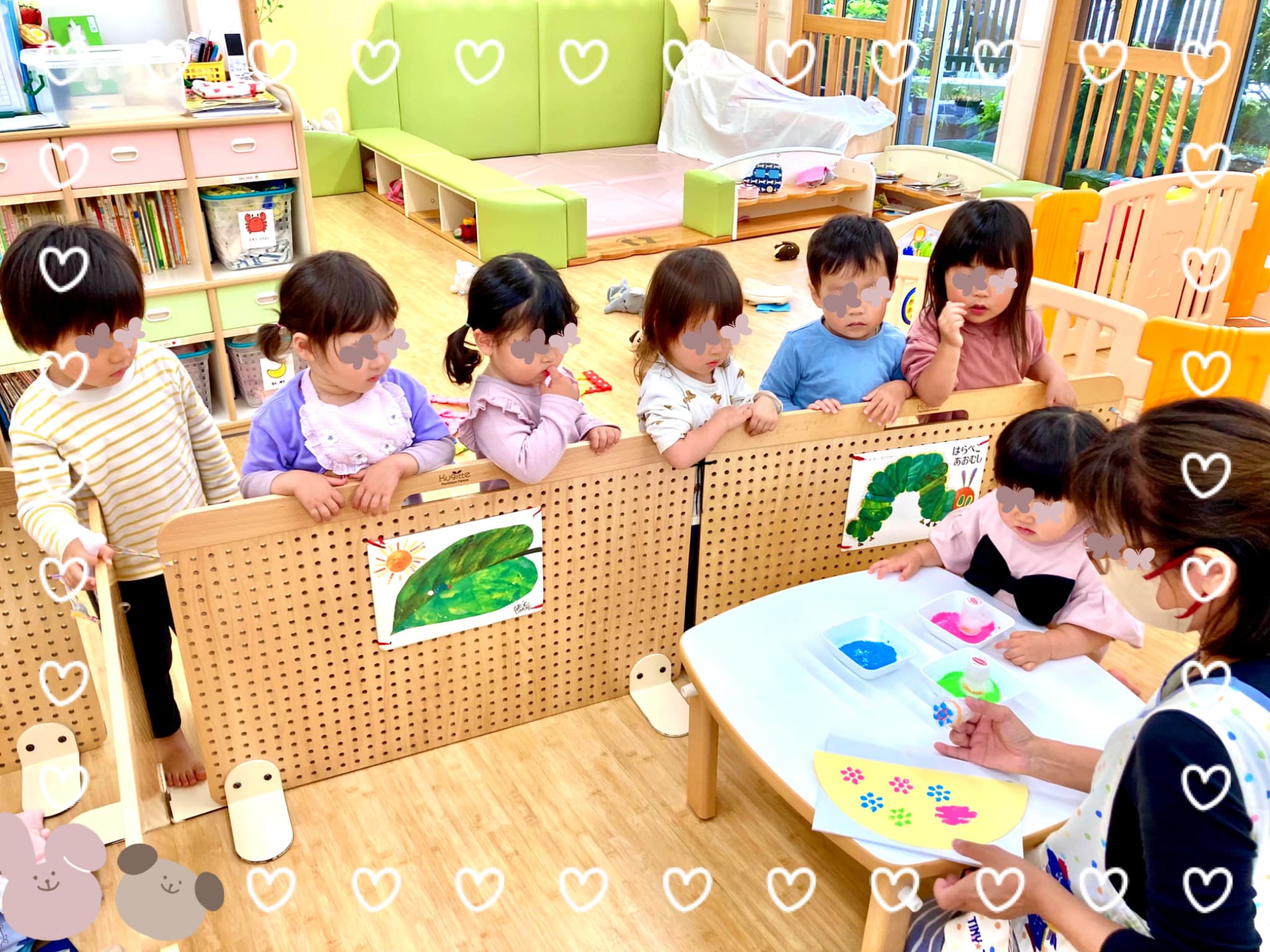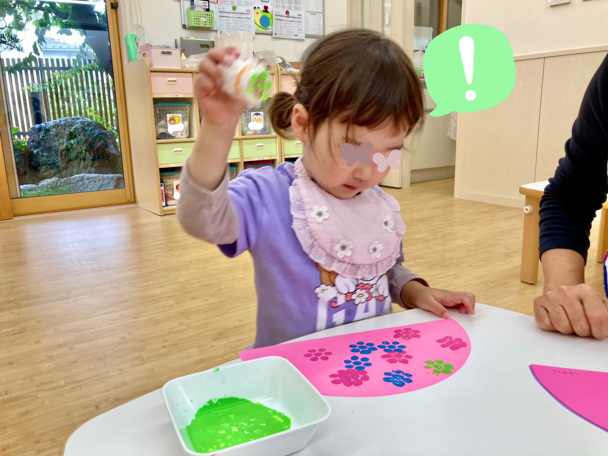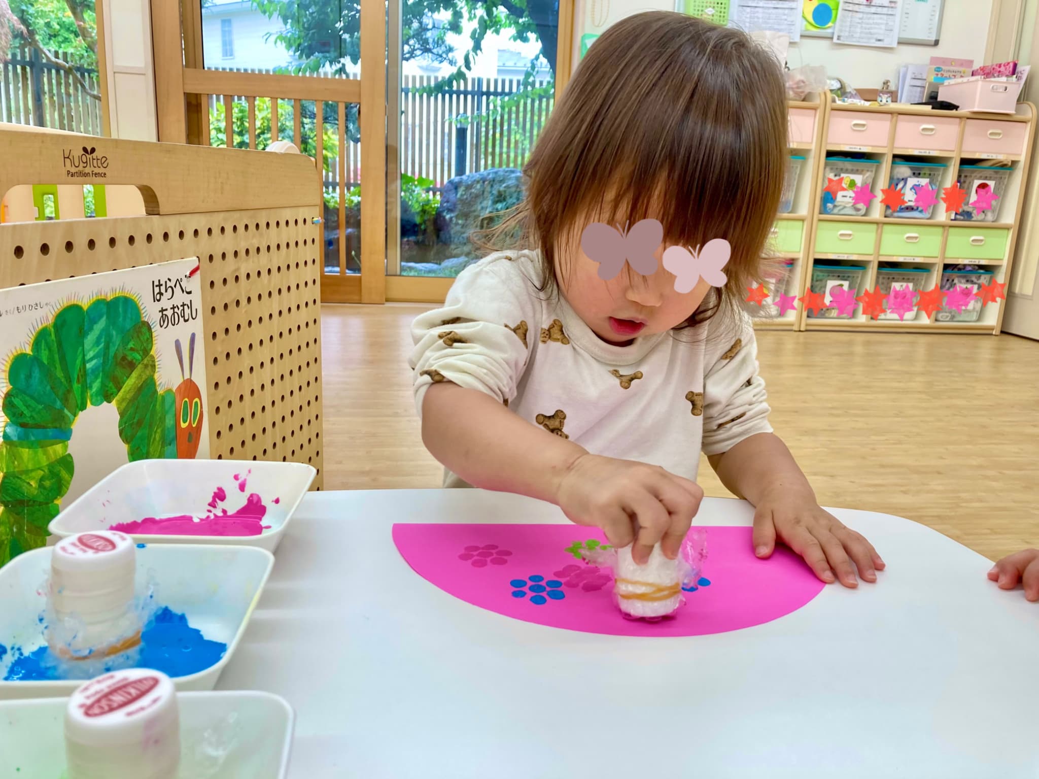 濃いめの絵の具を使って、スポンジスタンプでポンポンと色をのせていきます。使った色は、緑・ピンク・青の3色🌿💗💙