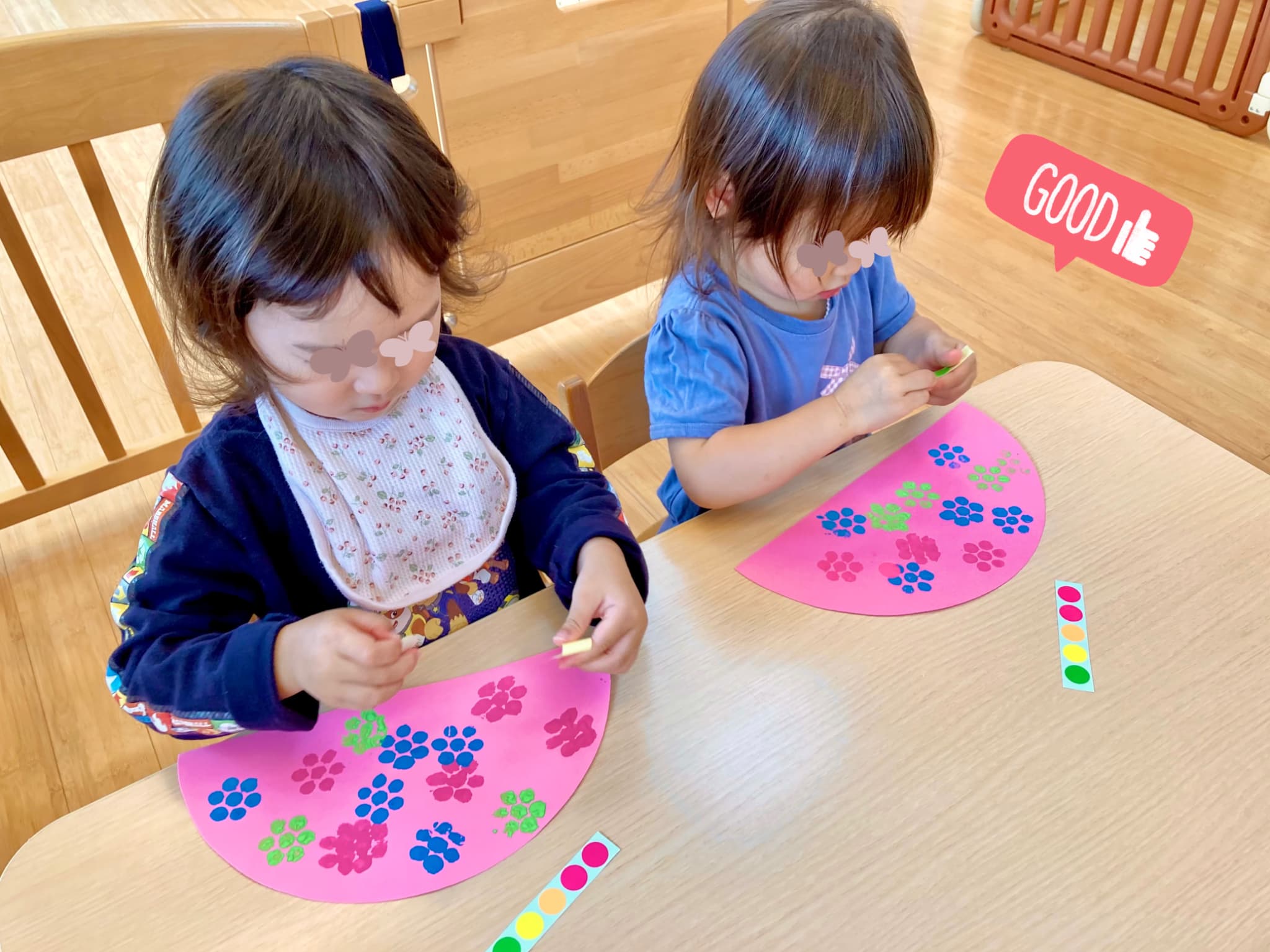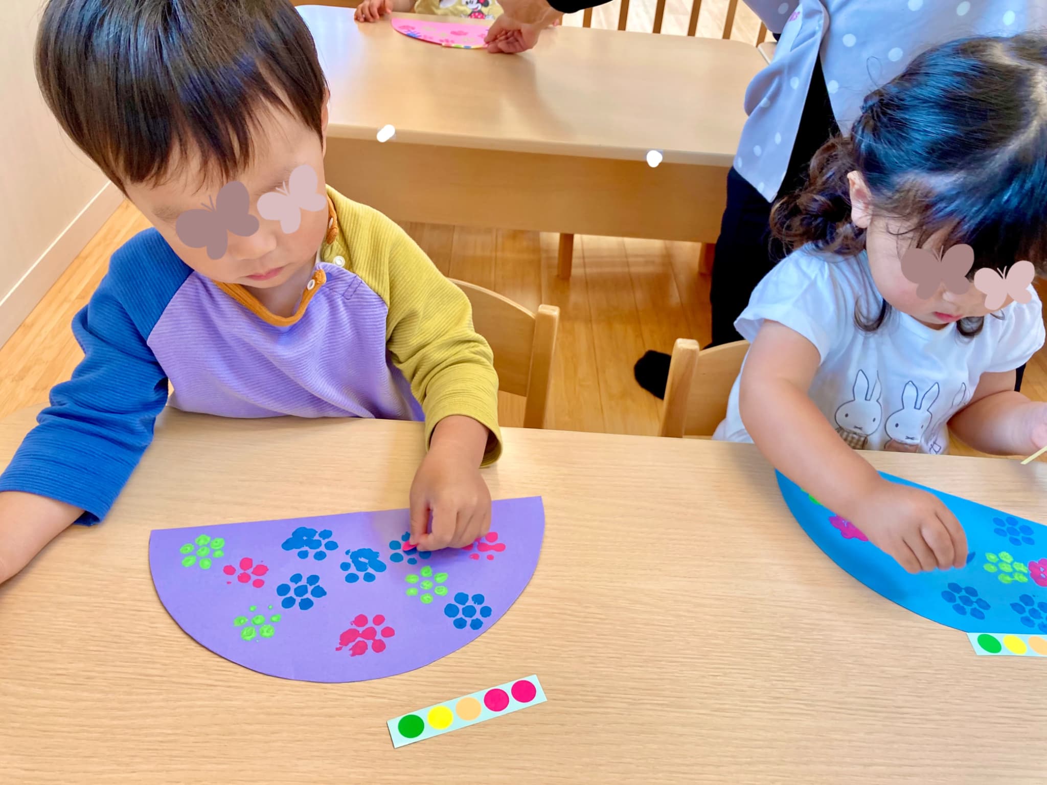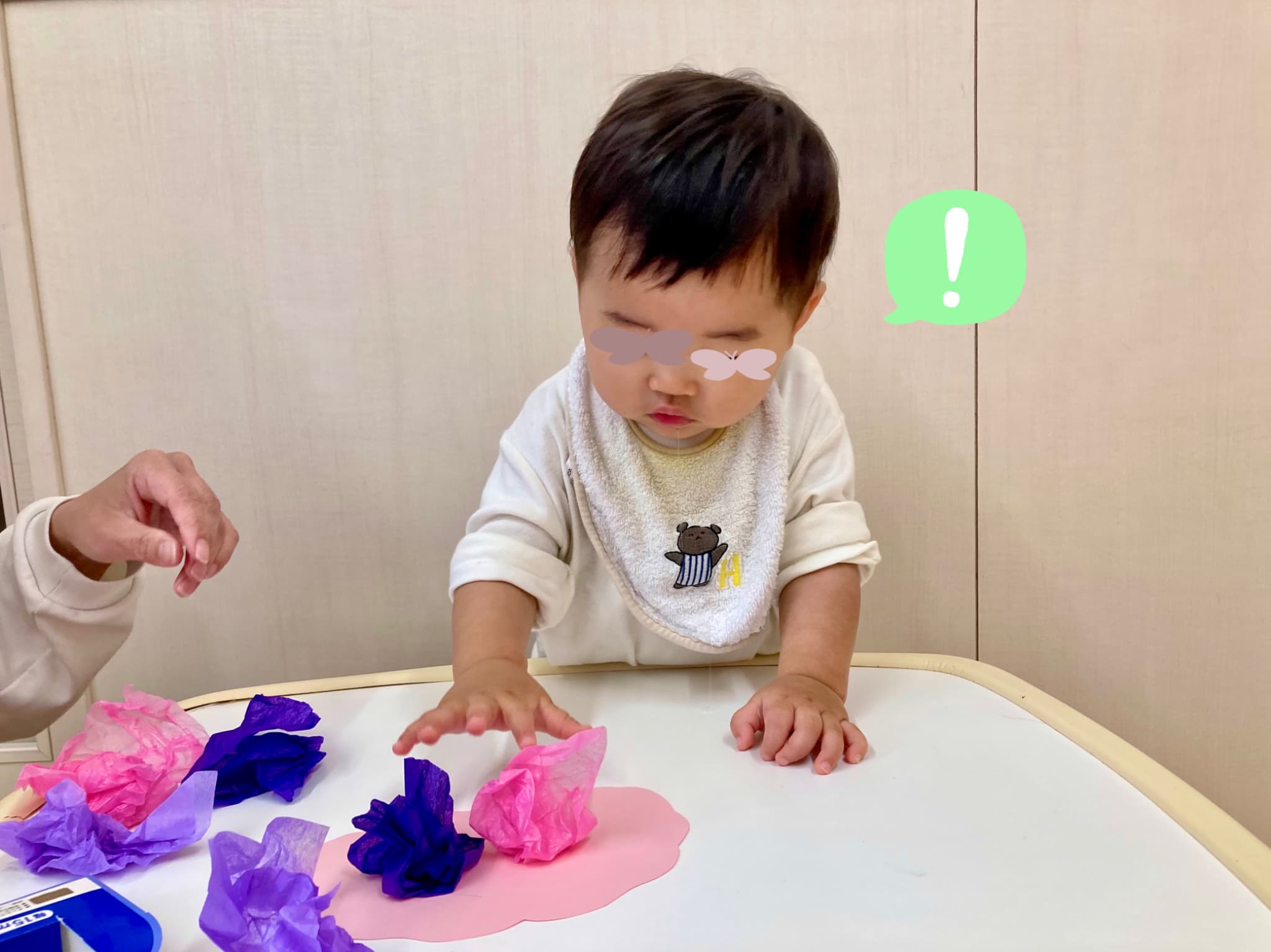 ふわふわの花紙をぎゅっと握って貼りつける工程では、初めはちょっぴり難しそうにしていた子どもたち。でも、繰り返すうちにだんだんと握る力の加減や指先の使い方が上手になり、両手で丁寧に丸める姿も見られるようになりました!👐