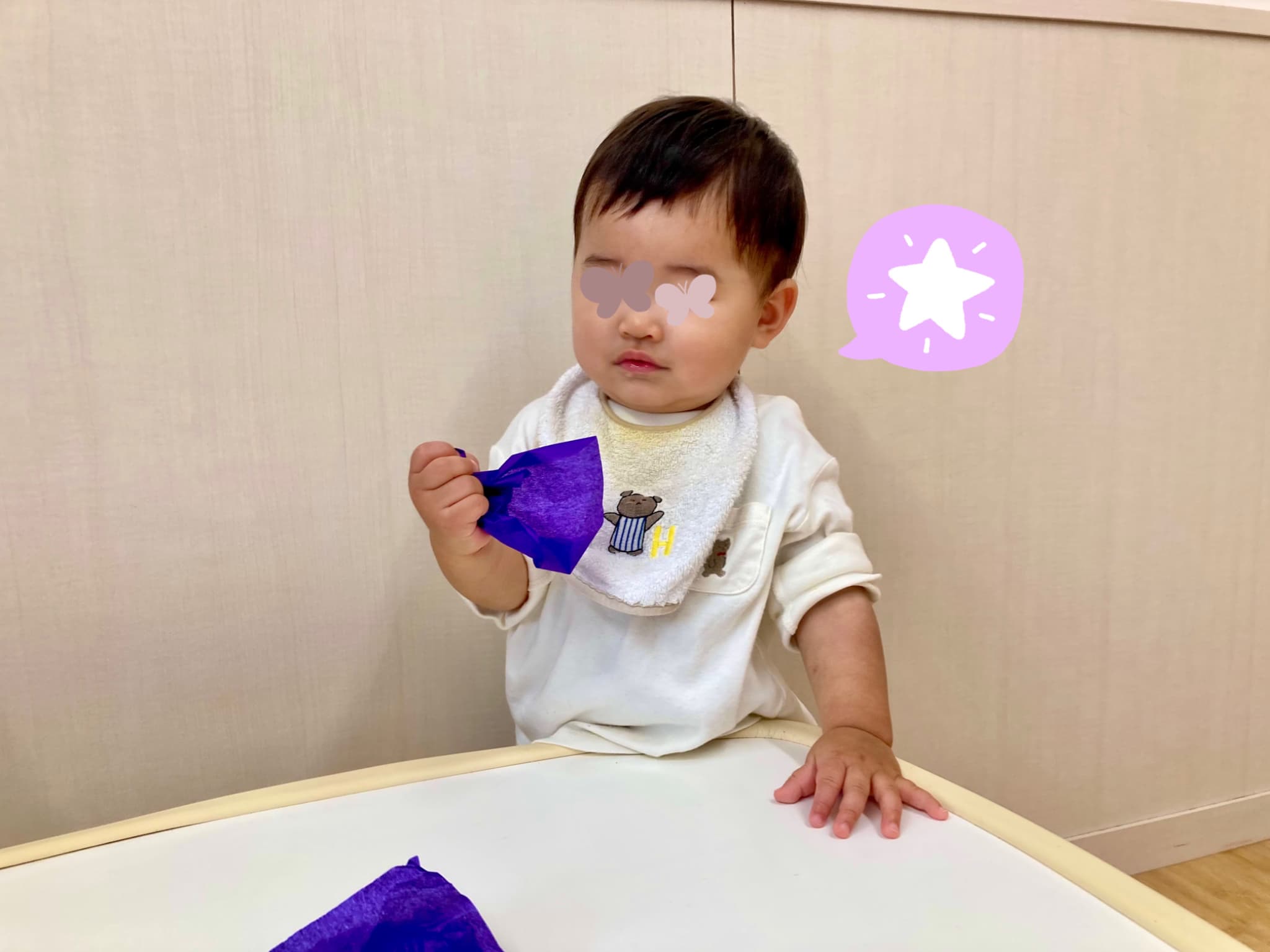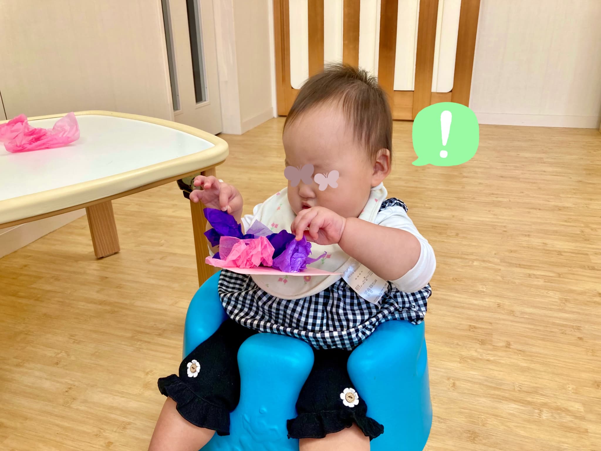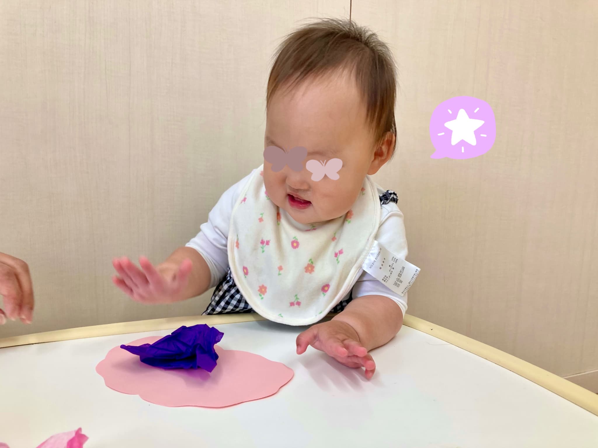 ふわふわの花紙をぎゅっと握って貼りつける工程では、初めはちょっぴり難しそうにしていた子どもたち。でも、繰り返すうちにだんだんと握る力の加減や指先の使い方が上手になり、両手で丁寧に丸める姿も見られるようになりました!👐