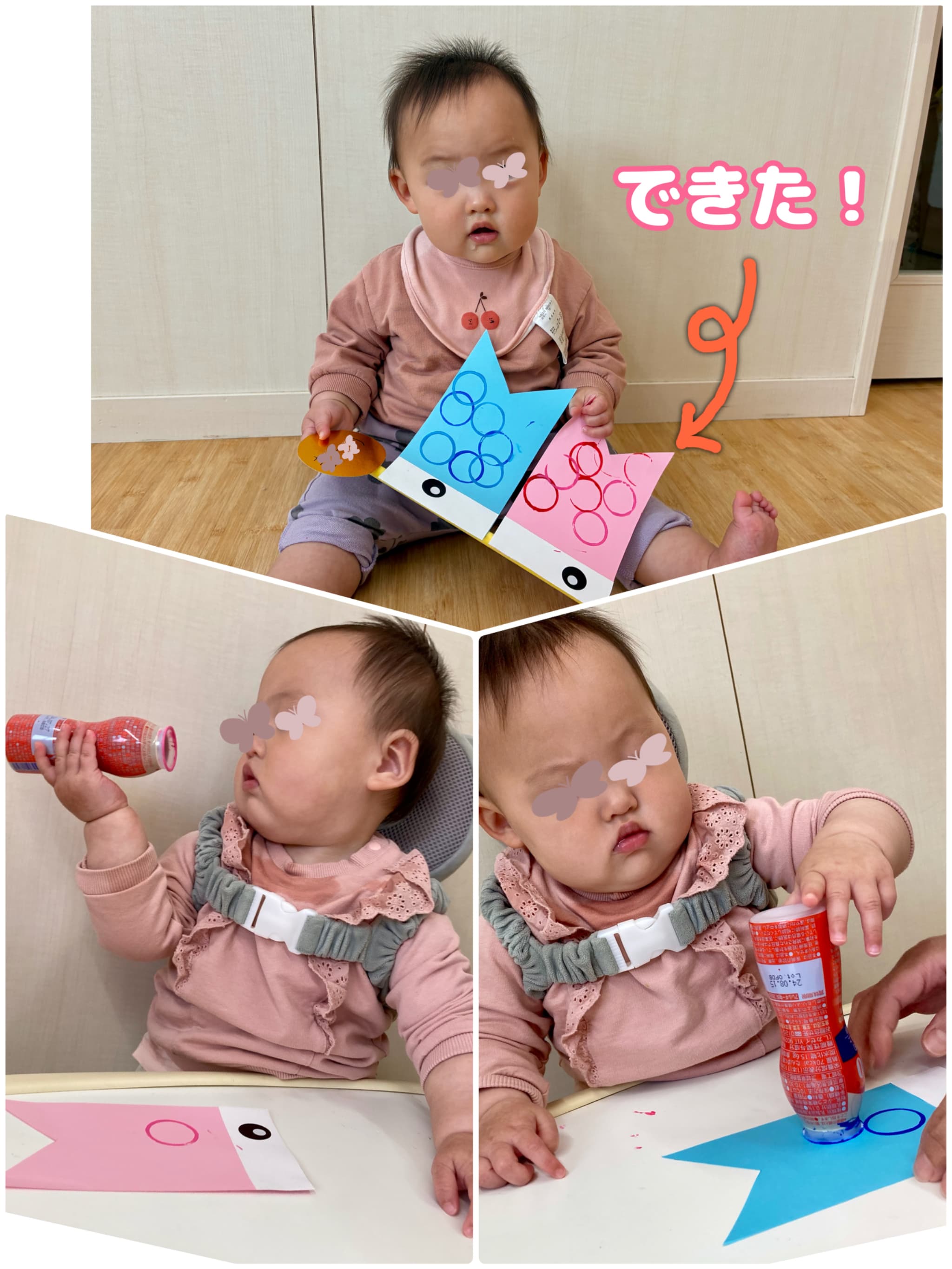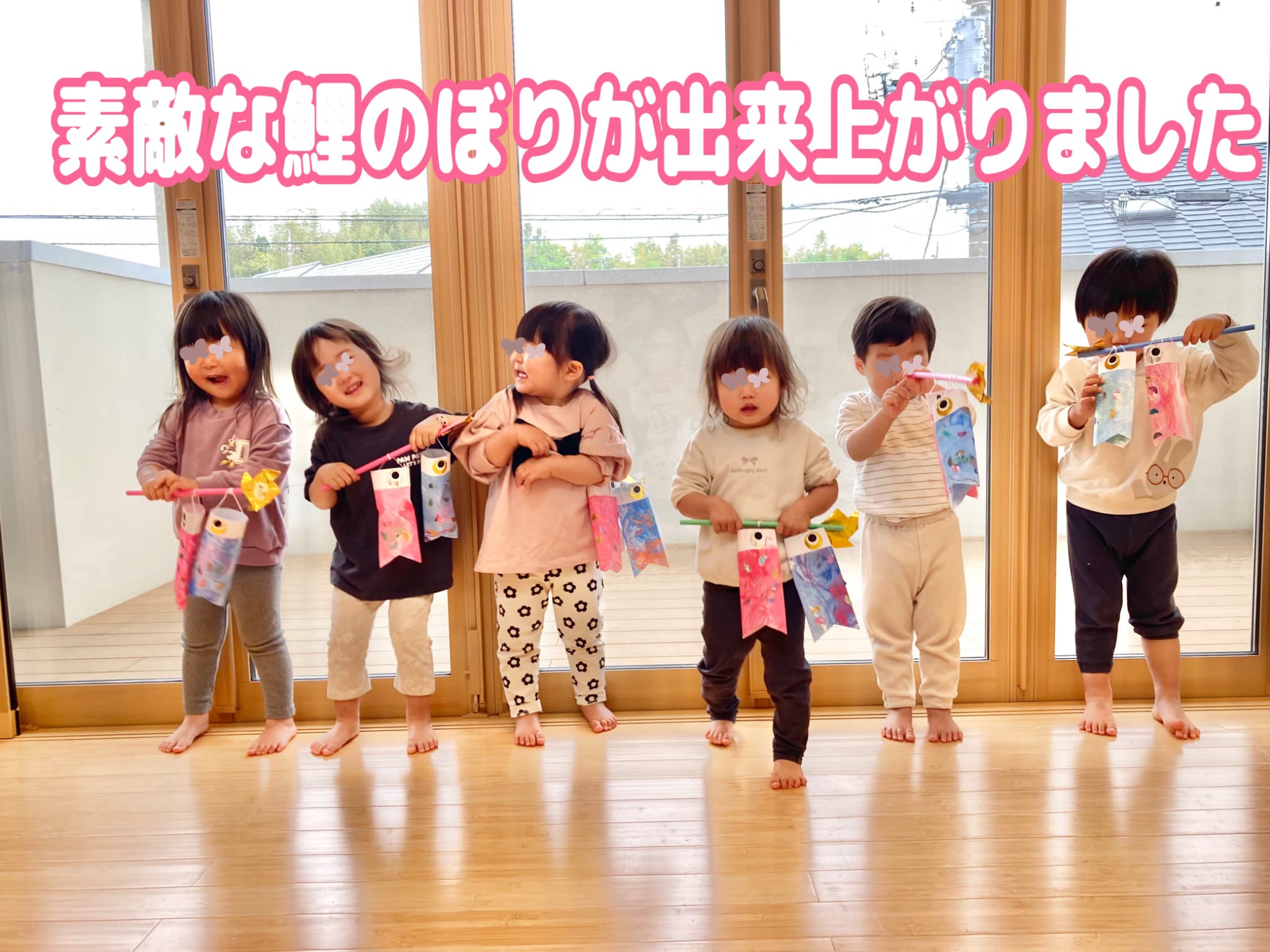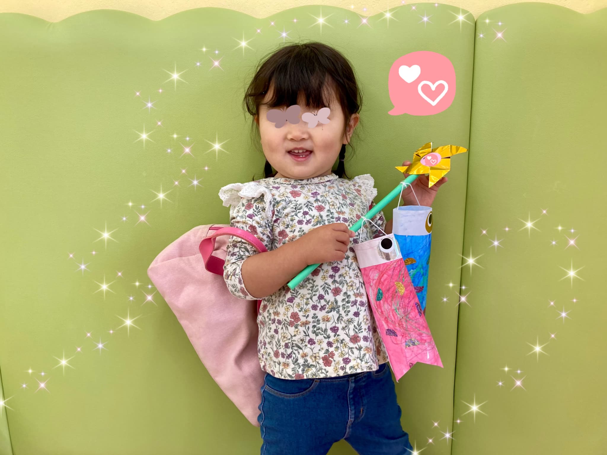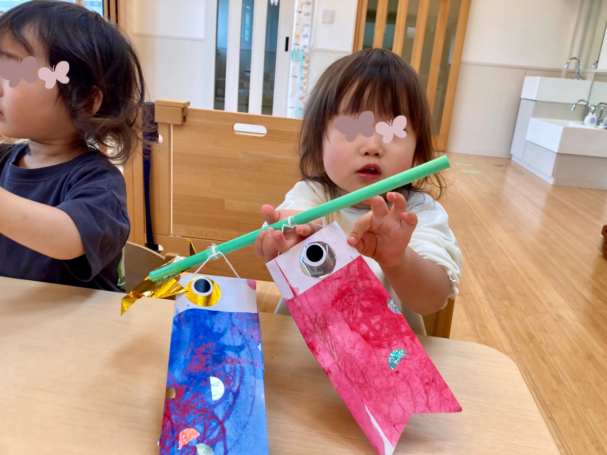 完成したものを見にいくと、「みてみて~!」と持ち手を握り締め、完成した鯉のぼりを見せてくれる姿にとってもほっこりしました♪