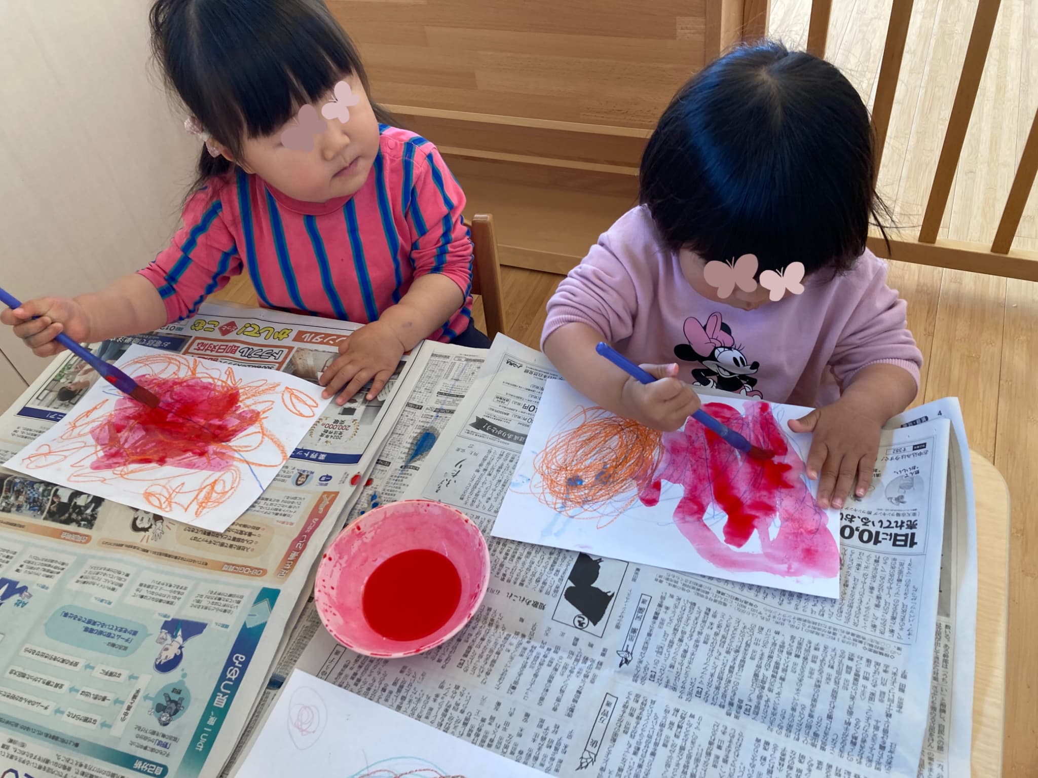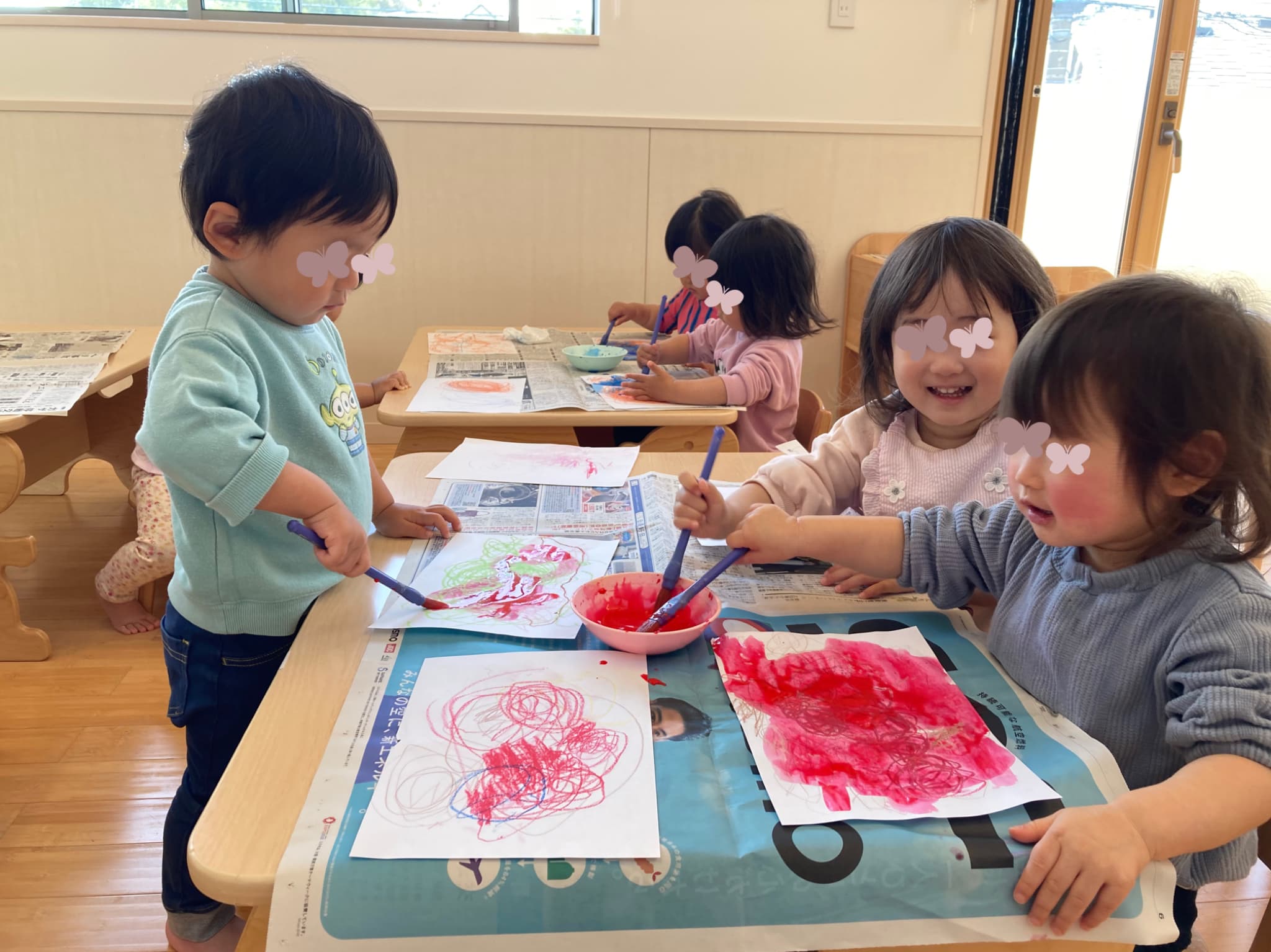2歳児クラスでは、筆を使っての絵の具塗りに挑戦🎨!