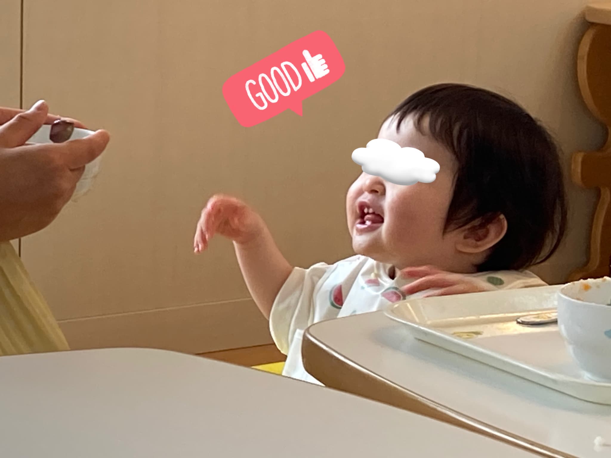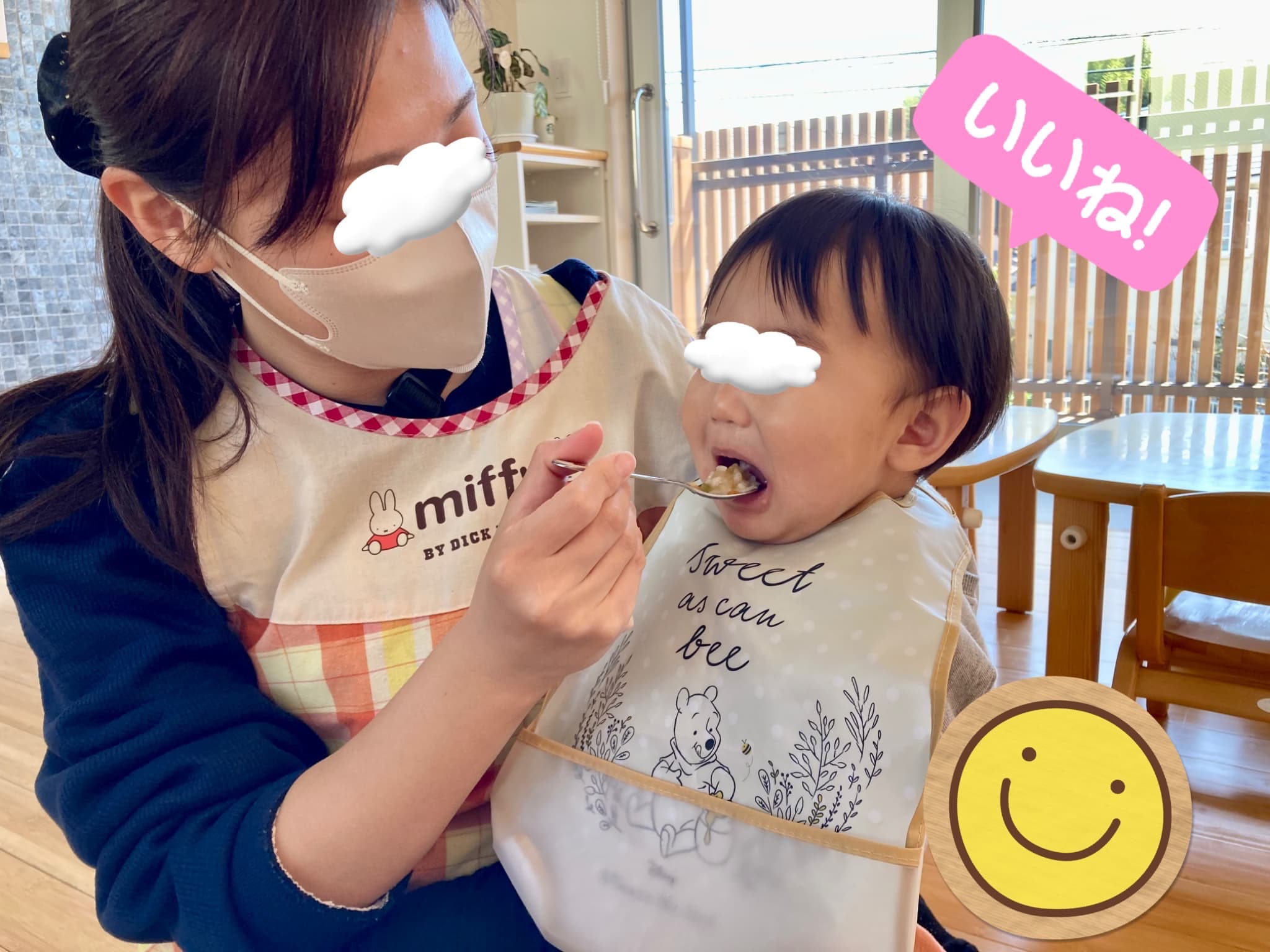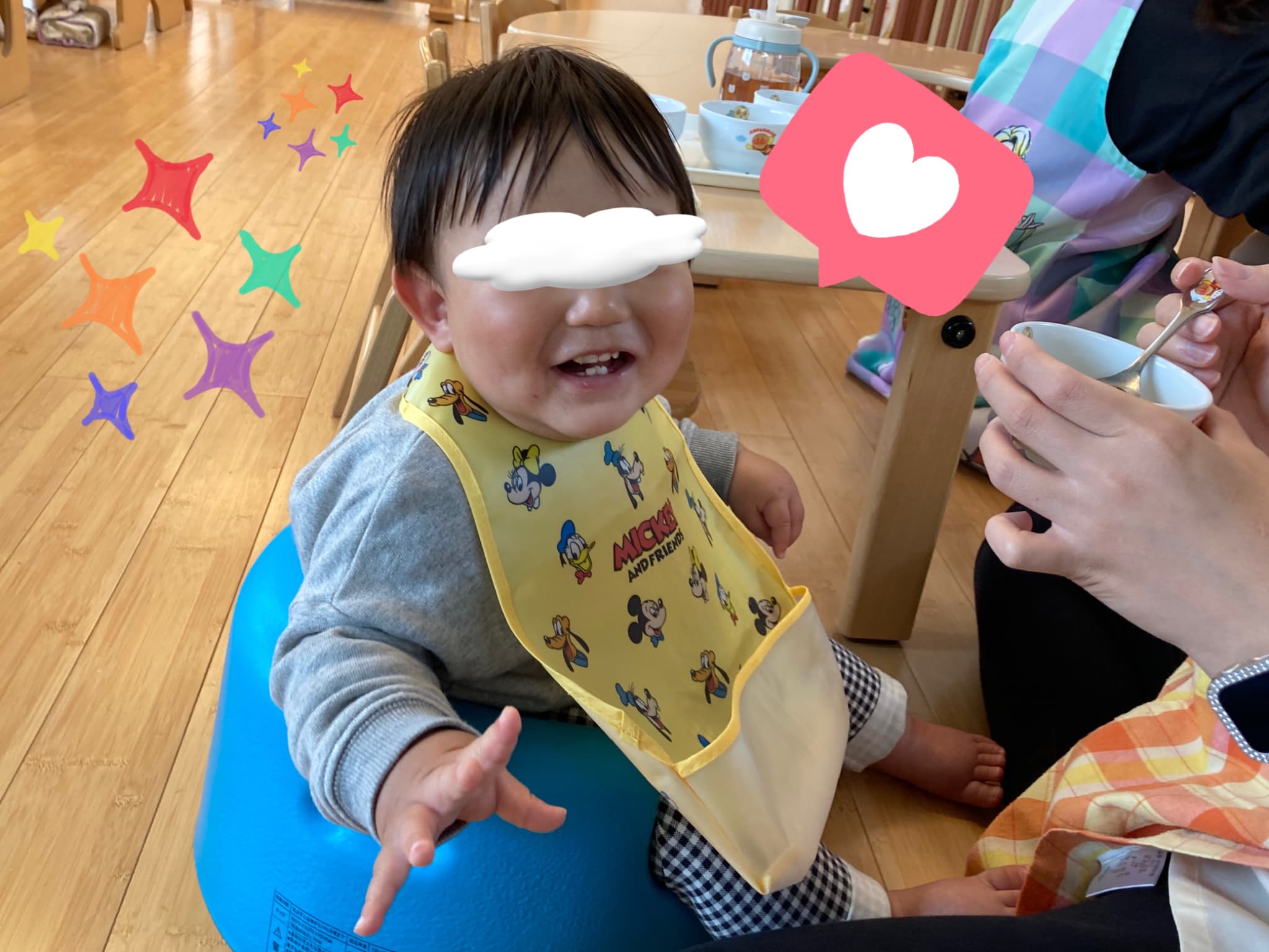 また、給食の時間には「もっとちょうだい!」「早く食べたい!」と、喃語(なんご)で一生懸命お話ししながらモリモリ食べる姿も見られ、抱っこや膝の上で遊ぶ時間が増えるに従って担任や職員との間に少しずつ信頼関係が結ばれていることを感じ嬉しく感じています!