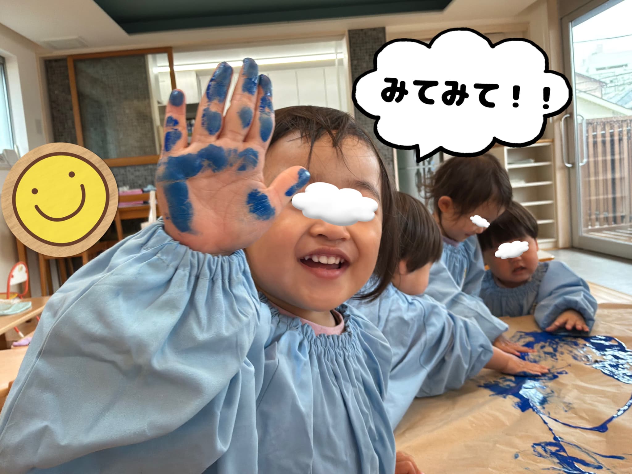 雨の日にはお部屋で手のひらを使ったダイナミックな「絵の具遊び」を楽しみました!👋