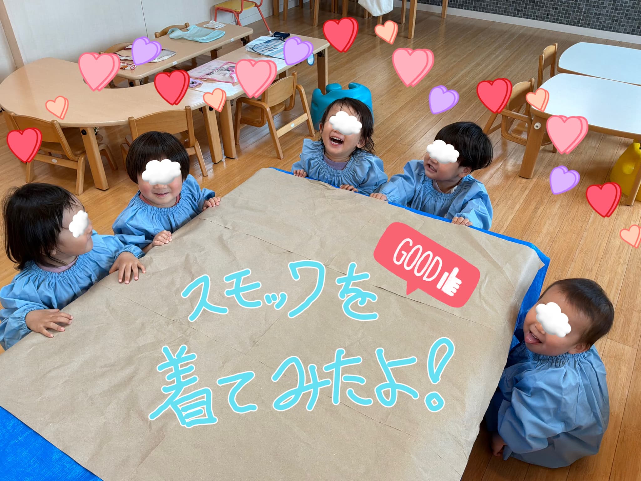 子ども達が着てきた服ができるだけ汚れないよう、汚れてもいい用の園にあるスモックを着てみたのですが、これが子どもたちに大喜び!😆